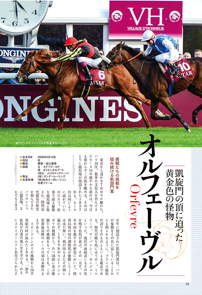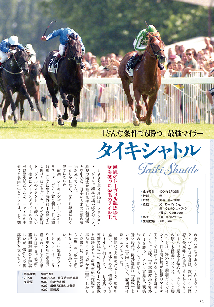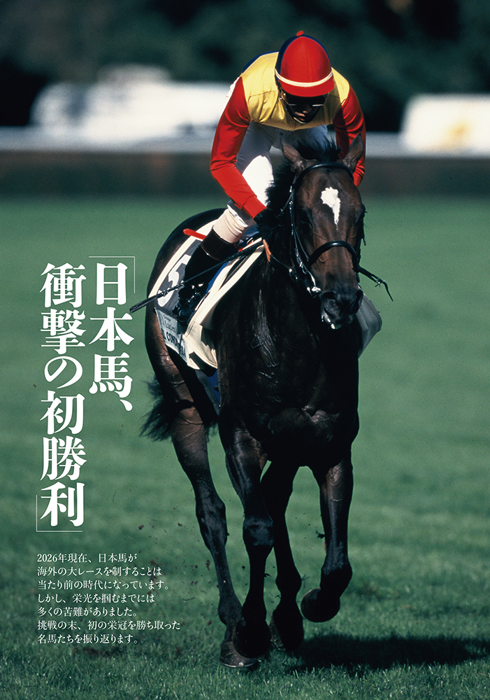 海外挑戦における黎明期の勝ち馬たちから、近年の勝ち馬まで総勢約40頭の名馬たちを写真付きで収録。当時の貴重なフルカラー写真とともに名馬たちの記憶を振り返る。