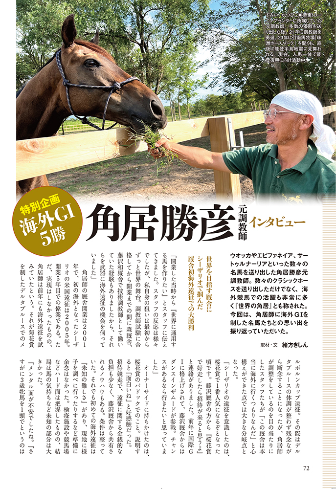 また「角居勝彦元調教師インタビュー」では、角居勝彦元調教師が過去に挙げた海外GⅠ「五勝」について回顧。シーザリオの挑戦から始まり、ハットトリックやデルタブルース、そしてヴィクトワールピサとルーラシップについて振り返るインタビューはまさに読み応え満点だ。