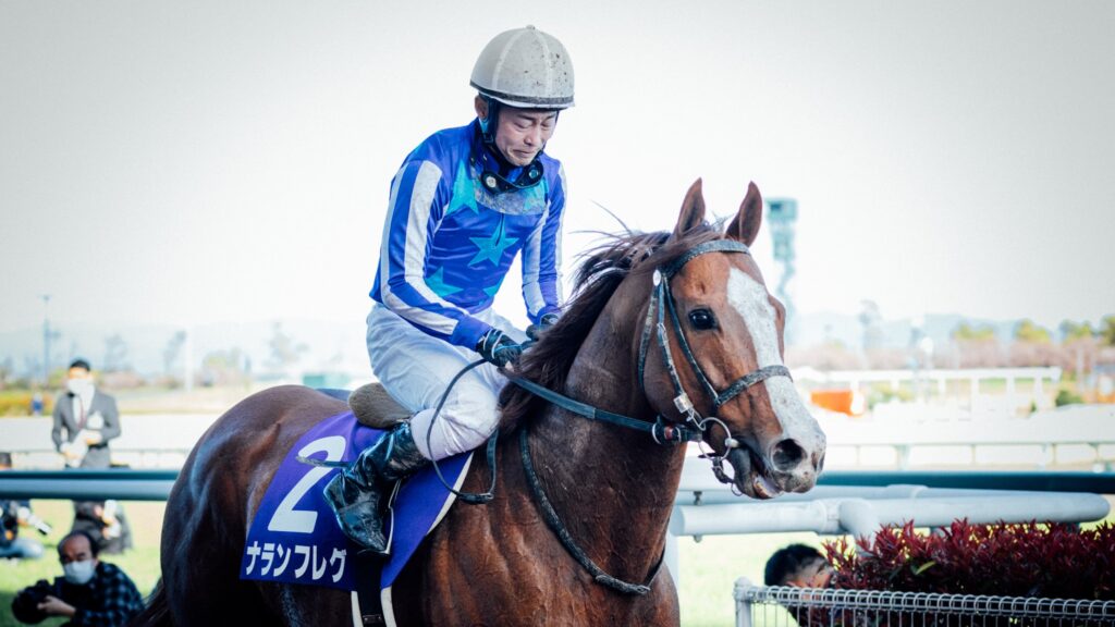 美浦・宗像義忠厩舎からデビューしたナランフレグの初戦は、10月東京ダート1300mの新馬戦だった。鞍上を任されたのは、この年の春までデビューから10年以上も宗像厩舎に所属していた丸田恭介騎手で、見事初陣を飾ったものの、そこから4戦して2勝目をあげることができなかった。