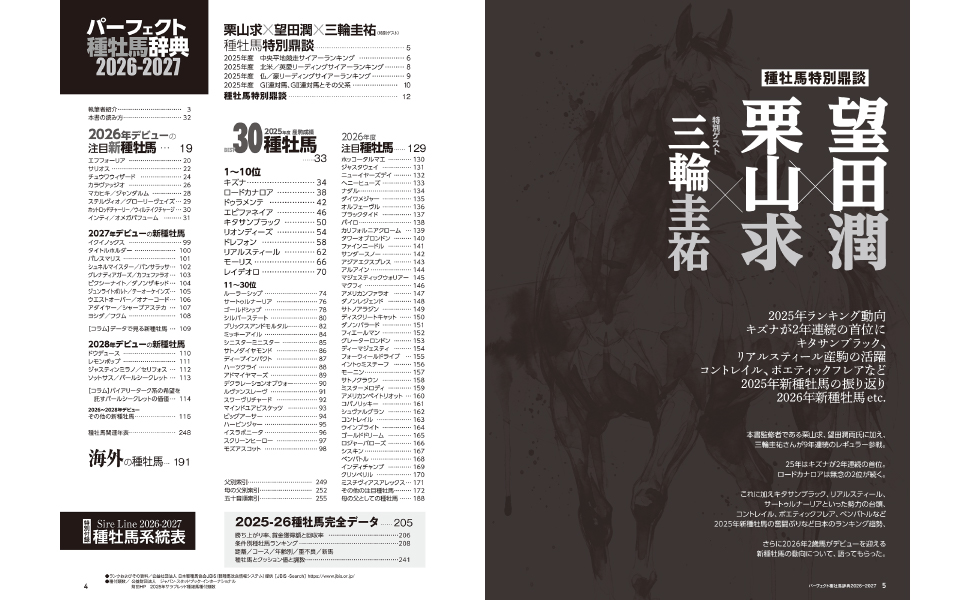 さらに、2025年ランキングで2年連続1位に輝いたキズナをはじめ、ランキング上位10頭は辻三蔵氏による産駒調教分析、久保和功氏による馬体分析、競馬映像ディレクター美野真一氏による撮影時の種牡馬エピソードなど4ページで紹介していいく。