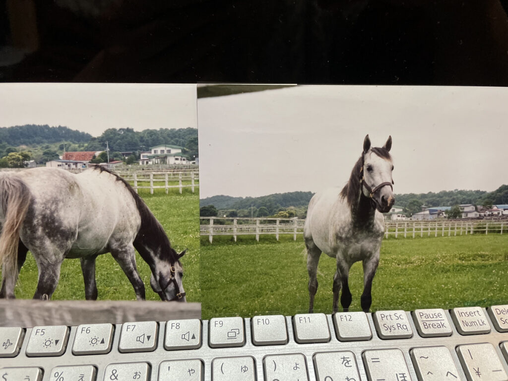 日付は『2000年7月17日』とある。曇天の空の下で、一頭の葦毛馬が草を食んでいる。日高ののどかな初夏の風景だ。ピントも甘ければ構図もだらしない、素人が写したものとすぐにわかるその写真は、結婚して6年目、欲しかった子宝にやっと恵まれたぼくたち夫婦が、もうじき2歳を迎えようとする長男を連れて、日高地方に引退馬巡りの旅行と洒落込んだ時に写したものだ。