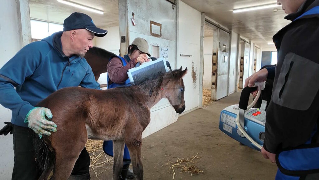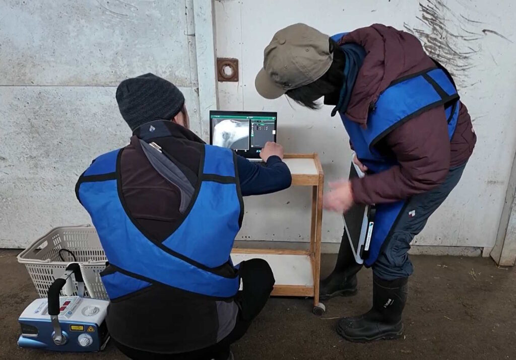 ラーメンを食べて牧場に戻り、原稿を書いたり、撮影に回ったりしていると、あっという間に夕方になり、獣医師の揖斐先生が往診に来てくれました。この日は、ムー子のレントゲンを撮り、目の前で診断をしてくれるとのこと。ちょうど僕が今日来るので、それに合わせて来てくださいました。