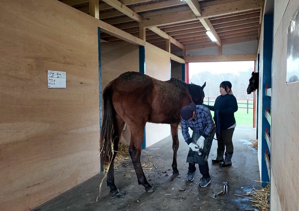 1本の肢の蹄を1分ぐらいの時間で削蹄していき、1頭につき約4~5分で削蹄作業は終わります。最後の肢の削蹄が終わっても、福ちゃんは「もう終わりですか?」という感じで、キョトンとしながら馬房に戻っていきました。続いてマンちゃん。4頭の中ではいちばん暴れていました。次にミーちゃん、最後にサバちゃんの順番です。普段は利かない性格のサバちゃんが、削蹄はそれほど面倒を掛けていなかったのは意外でした。肢を持たれて、削られることに対する抵抗感もそれぞれで異なるのでしょうね。