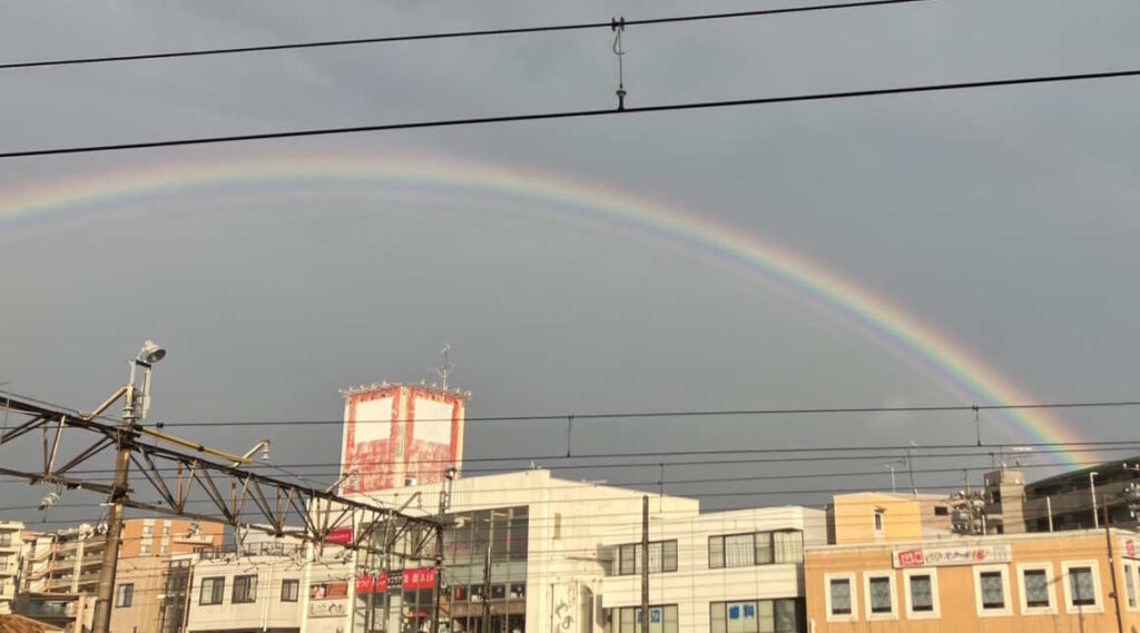 福ちゃんの声の人から、「今日とても大きな虹が見えました」と写真付きのLINEが入っていました。彼女も同じ誕生日のムー子の行く末を、東京から心配してくれていました。「ムー子の虹だね」と返すと、「大きな橋だから、ムー子もたくさん走れるよ。今ごろ虹の上ではしゃいでるね」。その瞬間、僕にはムー子が虹の橋をはしゃぎながら駆け上がっていく姿がはっきりと見えました。お転婆だったムー子は、こちらをよそ見しながら走っています。天国の牧場で僕はムー子を撫で、ムー子は僕に甘えてくれています。お母さんともゆっくり過ごせるといいね。
