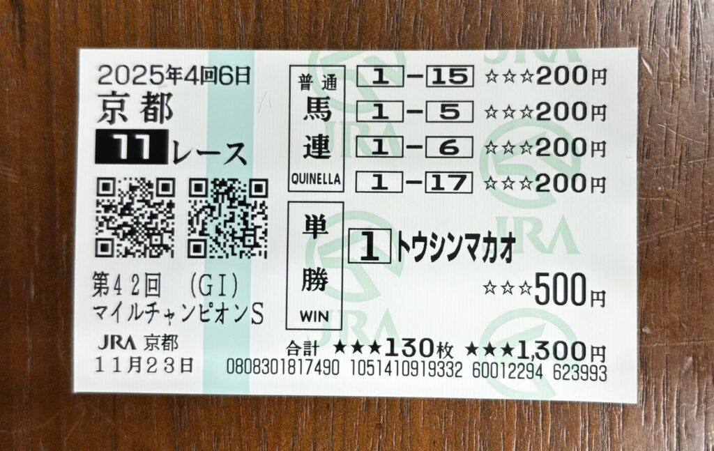 トウシンマカオの引退が発表された日、マイルチャンピオンシップ観戦時に着ていたジャケットのポケットから、1枚の馬券が出てきた。